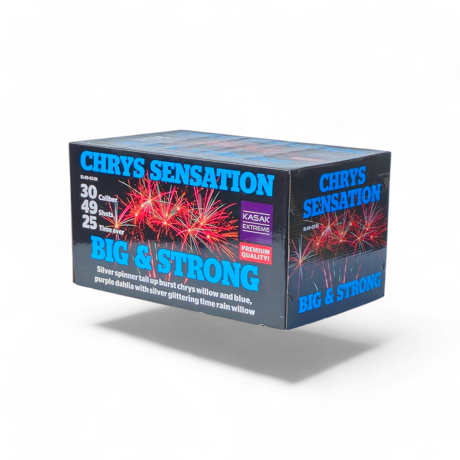 CHRYSANTHEMUM SENSATION BIG &STRONG to wyrzutnia kątowa oferująca atrakcyjny pokaz fajerwerków na domowe uroczystości i sylwestrową noc. Dzięki 49 strzałom o kalibrze 30mm oraz efektownym craclingowym palmom z brokatową koroną, zapewnisz sobie i swoim gościom niesamowite wrażenia wizualne podczas świętowania. Ten produkt łączy w sobie jakość polskiego importera z efektownymi rozwiązaniami pirotechnicznymi.