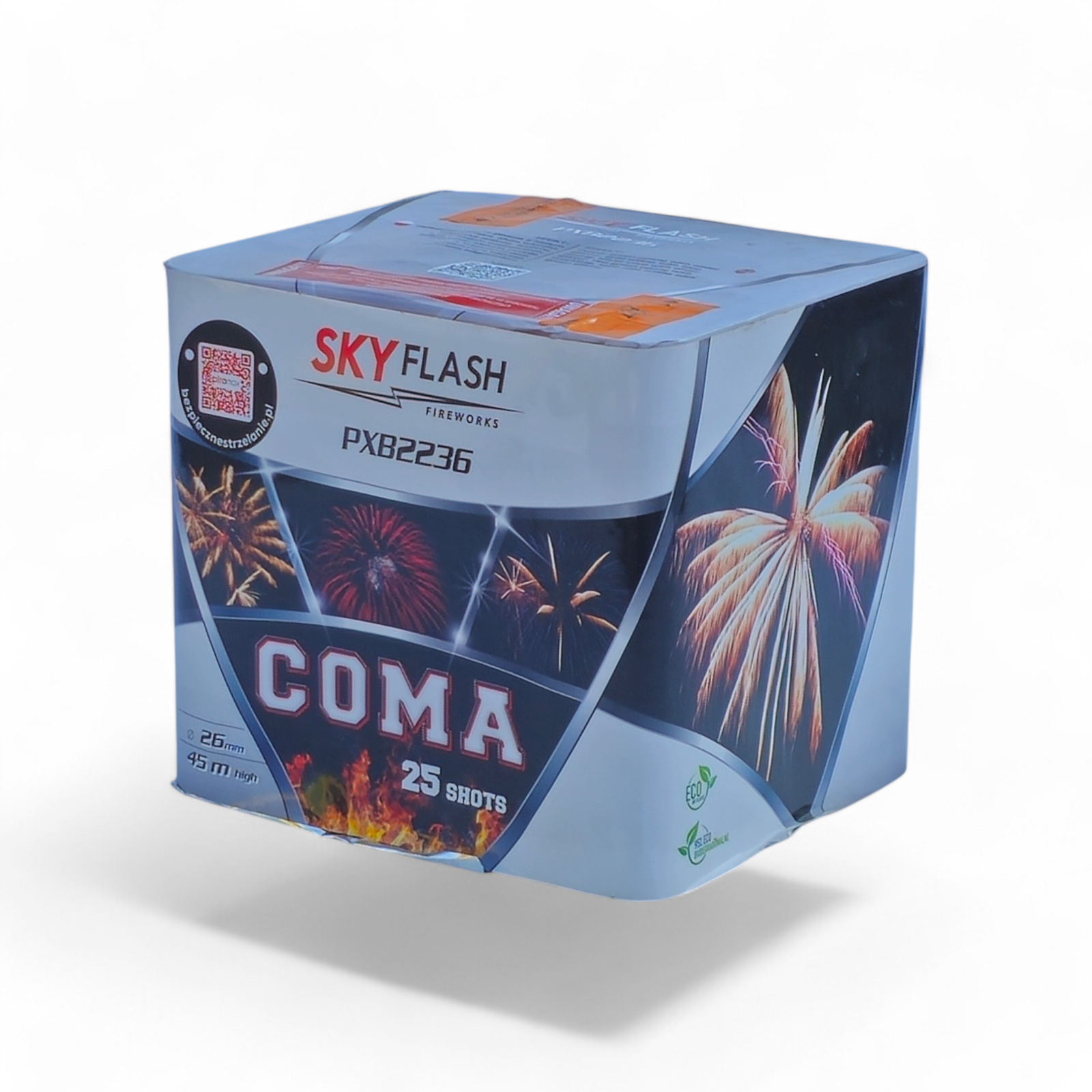 Wyrzutnia Coma PXB2236 od firmy Piromax to atrakcyjny zestaw pirotechniczny oferujący 25 strzałów o kalibrze 26 mm. Ten efektowny produkt zapewnia około 30 sekund dynamicznego pokazu fajerwerków z różnorodnymi efektami świetlnymi, które rozświetlą nocne niebo podczas Twojej uroczystości.