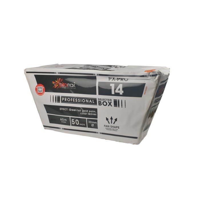 Wyrzutnia PX-PRO14 50 strzałów 30MM to doskonały wybór na sylwestrowe świętowanie i inne ważne okazje. Dzięki intensywnym złotym palmom z zielonymi ogonami oraz barwnym liściom, oferuje naprawdę atrakcyjny pokaz, który zapadnie w pamięć wszystkim obecnym. Z klasyfikacją F3 gwarantuje moc wrażeń przy zachowaniu standardów bezpieczeństwa.