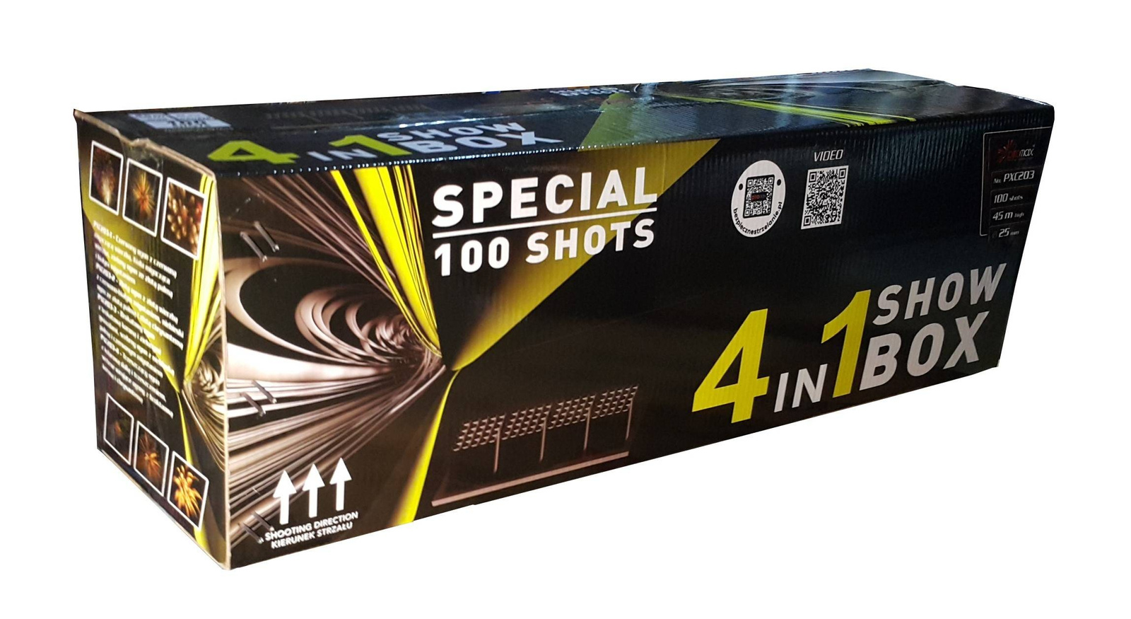 OGROMNY ZESTAW SHOW BOX 4 IN 1 PXC203 PEŁEN ROŻNYCH EFEKTÓW. SKŁADA SIĘ Z 100 STRZAŁÓW O KALIBRZE 25MM. CZAS TRWANIA NIEZWYKŁEGO POKAZU TO OK. 1,5 MIN PO ODPALENIU. ZESTAW W KATEGORII F2.