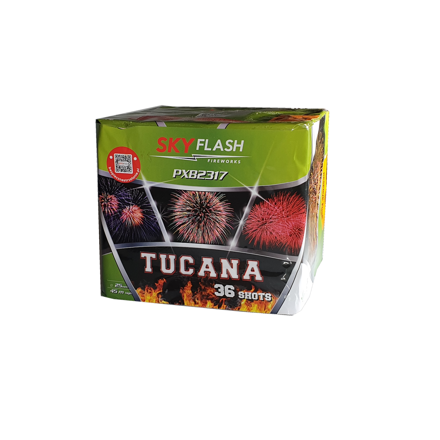 Wyrzutnia TUCANA 36 strzałów to efektowny fajerwerk na sylwestrowe świętowanie, oferujący kolorowy pokaz na nocnym niebie. Ten produkt marki Piromax, o kalibrze 25 mm, zapewnia 36 wystrzałów wypełniających niebo barwnymi brokatowymi koronami przez około 30 sekund.