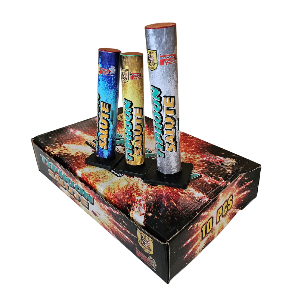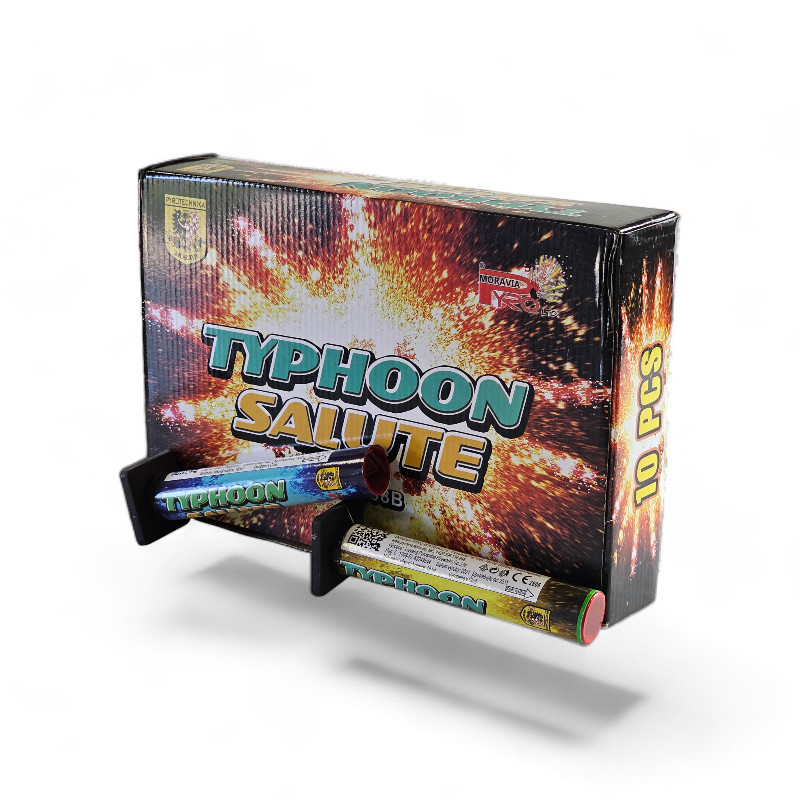 TYPHOON SALUTE MIX to wyjątkowy zestaw 10 single shotów od renomowanej marki Pyro Moravia, oferujący różnorodne efekty pirotechniczne na niebie. Każdy pojedynczy wystrzał tworzy inny, kolorowy efekt, zapewniając urozmaicone wrażenia wizualne podczas Twojego pokazu.