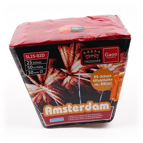 Wyrzutnia AMSTERDAM 25 STRZAŁÓW to efektowny fajerwerk firmy Gaoo Management, który zapewni wyjątkowe wrażenia wizualne podczas uroczystości rodzinnych. Składa się z 25 strzałów o kalibrze 30 mm, oferujących 30-sekundowy pokaz pełen srebrnych palm, spadających tytanowych komet z niebieskimi brokatem oraz efektami trzeszczącego ognia, zakończony intensywnym finałem.
