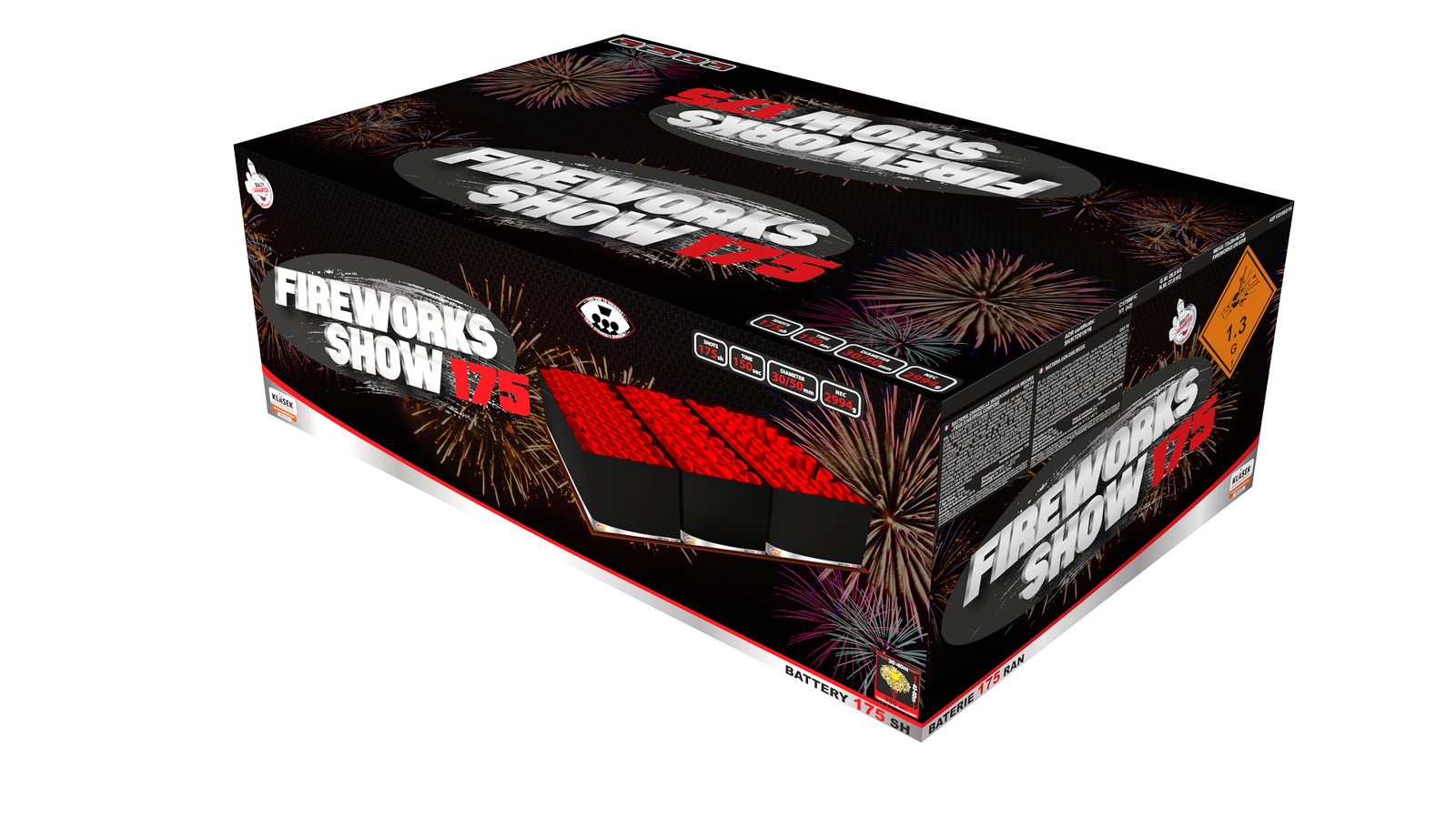 FIREWORKS SHOW 175 C175MF/C TO WIELKI ZESTAW Z NIESAMOWITYMI EFEKTAMI. SKŁADA SIĘ Z AŻ 175 STRZAŁÓW O KALIBRZE 30-50MM. ZADZIWIAJĄCY POKAZ MOŻNA OGLĄDAĆ PRZEZ 2,5MIN. WYRZUTNIA W KATEGORII F3.