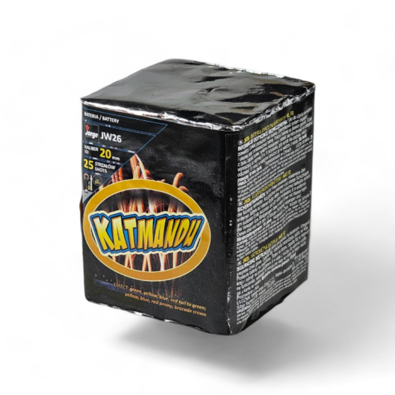 Wyrzutnia Katmandu 26 strzałów to atrakcyjny fajerwerk marki Jorge, oferujący różnorodne efekty świetlne w formie kolorowych komet i piwonii. Ta bateria fajerwerków o kalibrze 20mm zapewnia widowiskowy pokaz trwający około 20 sekund, wypełniając niebo kolorowymi efektami zakończonymi brokatem.