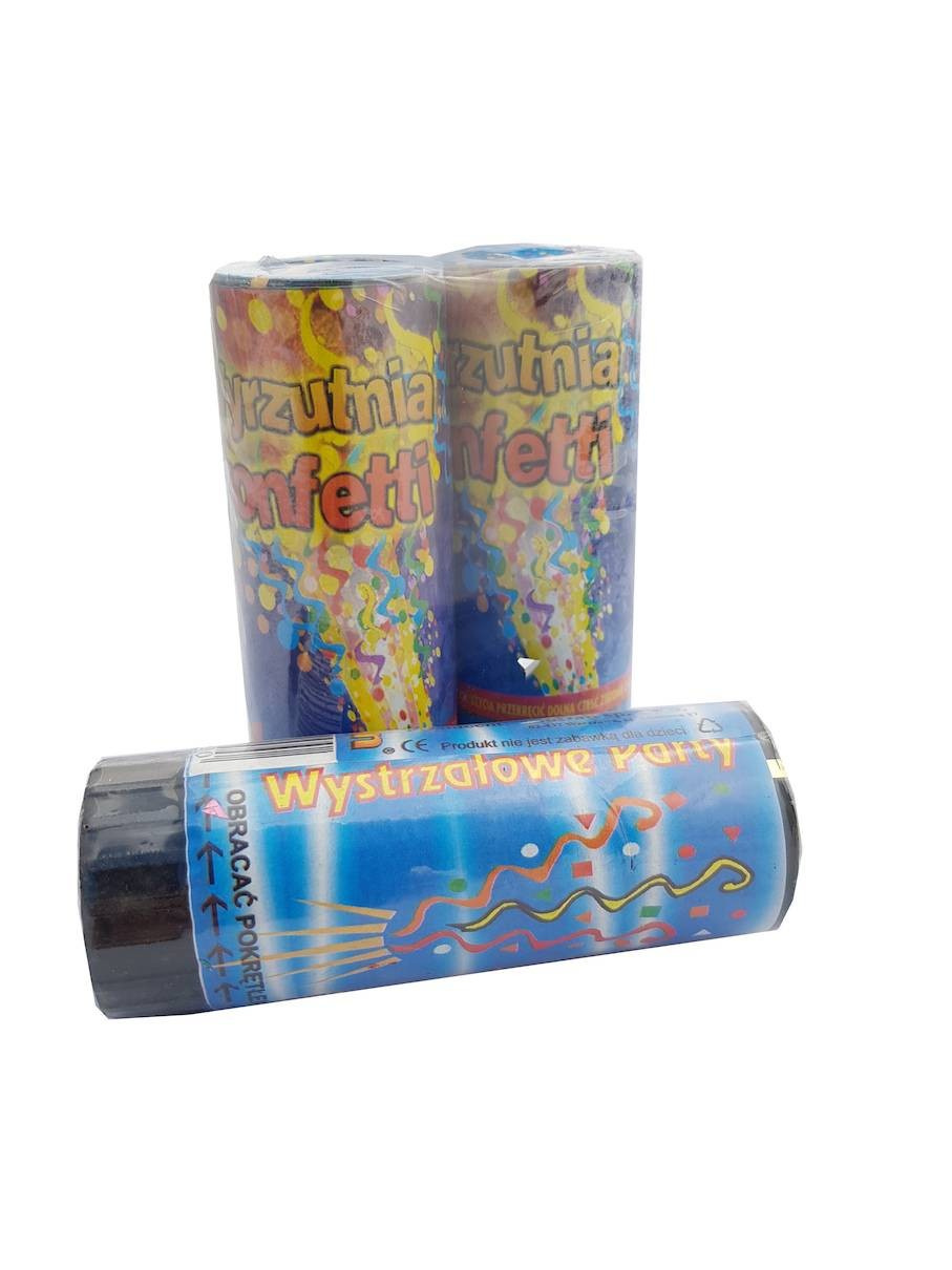 DWIE MAŁE TUBY KOLOROWEGO KONFETTI. BEZ TEGO NIE MOŻE OBYĆ SIĘ ŻADNA IMPREZA. WYSTARCZY PRZEKRĘCIĆ PLASTIKOWE POKRĘTŁO I KONFETTI WYSTRZELI W WYBRANYM PRZEZ NAS KIERUNKU.