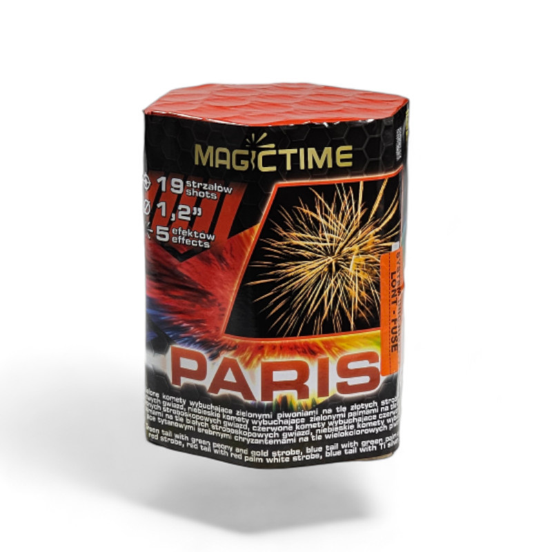 Paris 19 strzałów 30mm to efektowna wyrzutnia fajerwerków od marki Kometa, która zapewni atrakcyjny pokaz na niebie. Ten produkt o symbolu P7162 oferuje serię 19 wystrzałów o kalibrze 30 mm, tworząc kolorowe kompozycje pirotechniczne przez około 30 sekund.