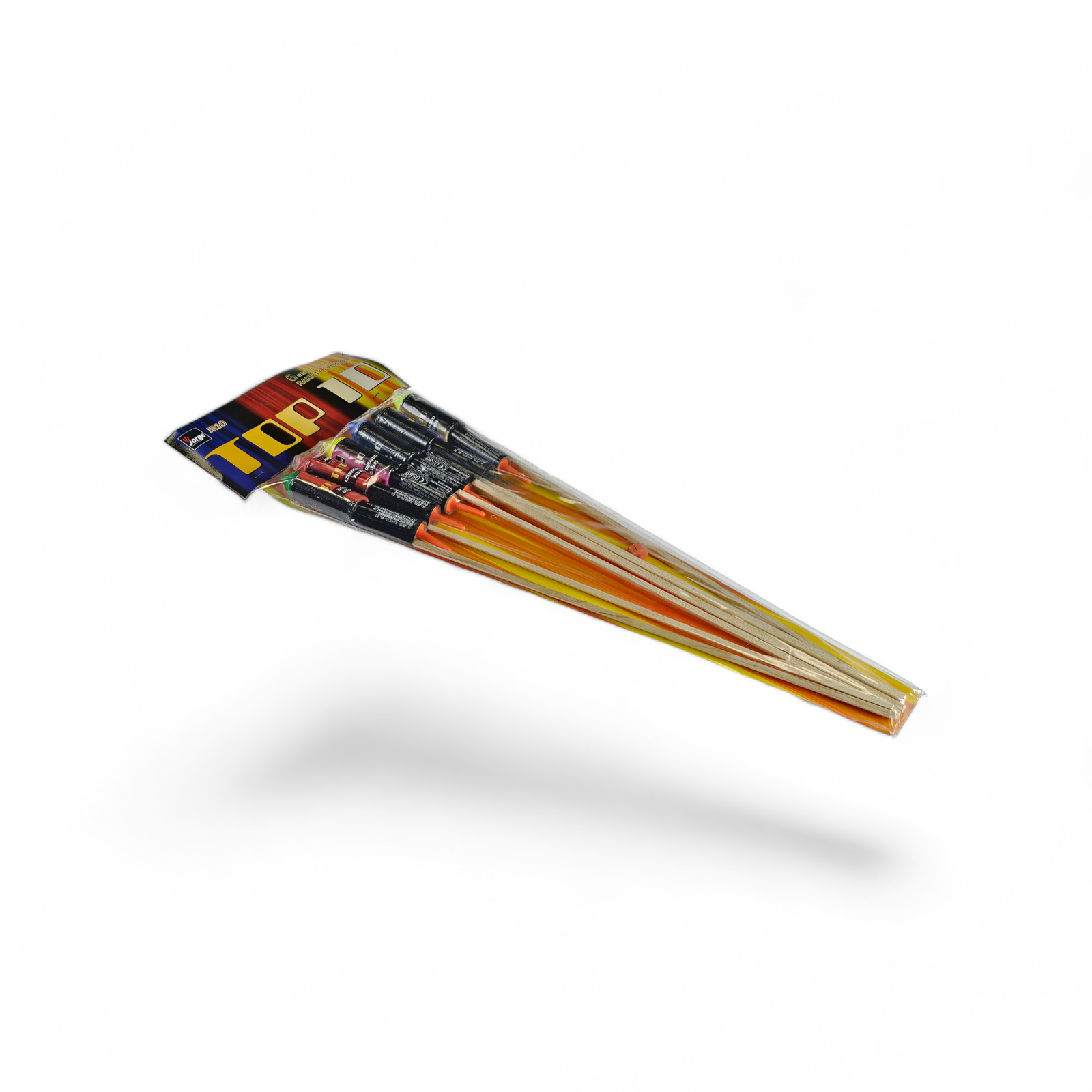 Przed odpaleniem rakiet TOP 10 wybierz otwartą przestrzeń, z dala od budynków, drzew i innych przeszkód. Umieść rakietę w stabilnej, pionowej pozycji, najlepiej wkładając patyk rakiety do pustej butelki wkopanej częściowo w ziemię. Upewnij się, że rakieta stoi stabilnie i może swobodnie wzlecieć. Zapal lont przy użyciu długiej zapałki lub lontu pomocniczego i natychmiast odejdź na bezpieczną odległość minimum 8 metrów. Nigdy nie pochylaj się nad rakietą podczas zapalania lontu. Po wystrzeleniu wszystkich rakiet, odczekaj co najmniej 15 minut przed zbliżeniem się do miejsca startu, aby upewnić się, że wszystkie lonty całkowicie zgasły.