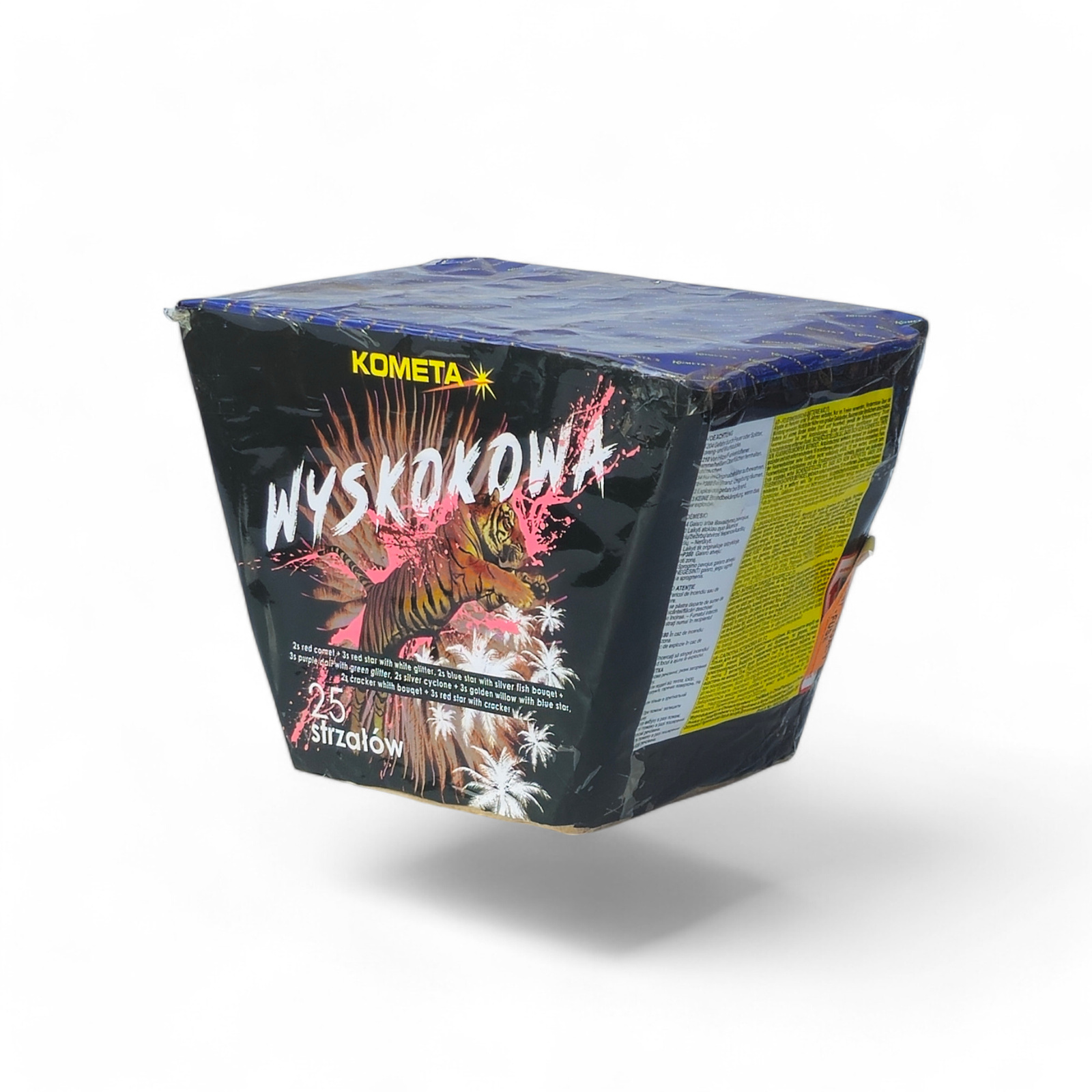 Wyrzutnia fajerwerków WYSKOKOWA 25 STRZAŁÓW 30MM od marki Kometa to efektowna bateria pirotechniczna, która zapewni wyjątkowe wrażenia podczas domowych uroczystości. Ten produkt oferuje kaskadowe połączenia różnego rodzaju pojedynczych strzałów, które tworzą na wieczornym niebie zachwycającą kombinację kolorowych rozprysków, wzbogaconych o atrakcyjne efekty akustyczne. Czas trwania pokazu to około 30 sekund nieprzerwanych wrażeń.