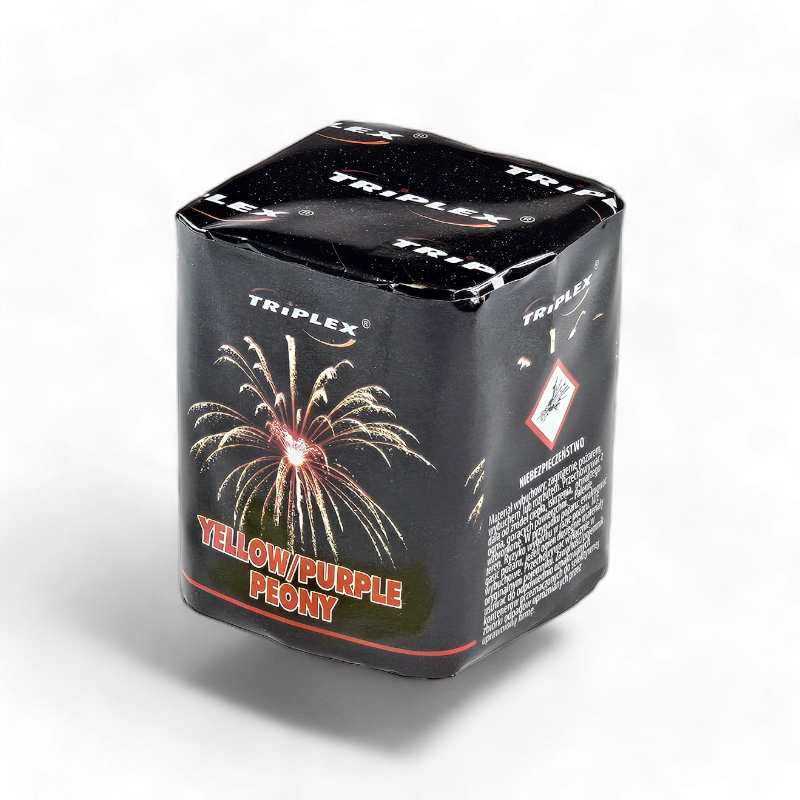 YELLOW/PURPLE PEONY to efektowny fajerwerk typu bateria, oferujący 9 wystrzałów o kalibrze 20mm w żółto-purpurowej kolorystyce. Ten produkt marki Triplex zapewnia około 20 sekund dynamicznego pokazu, tworząc na niebie piękne, kolorowe piwonie, które rozświetlą Twoją domową uroczystość.