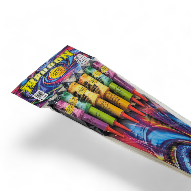 Zestaw rakiet Typhoon 6 sztuk to dobry wybór dla osób poszukujących prostych, ale efektownych fajerwerków na domowe uroczystości. Zróżnicowane efekty wizualne, jak czerwona gwiazda z crackling, zielony brokat czy srebrna palma, zapewnią przyjemne urozmaicenie Twojej imprezy. Dzięki certyfikacji F2 możesz cieszyć się pokazem z zachowaniem odpowiednich standardów bezpieczeństwa.