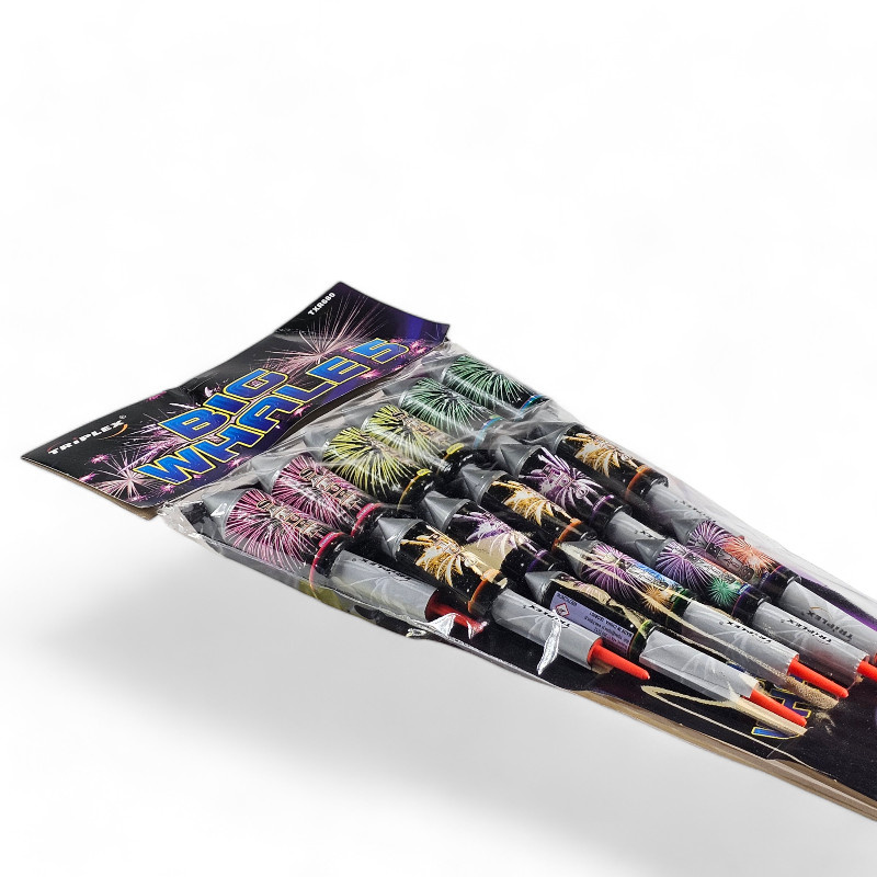 Komplet 15 rakiet BIG WHALE 5 od Triplex to wszechstronny zestaw pirotechniczny, który uatrakcyjni każdą domową uroczystość. Dzięki różnorodności rozmiarów i efektów, możesz przygotować ciekawy, kilkuminutowy pokaz fajerwerków, który zachwyci rodzinę i przyjaciół. Certyfikacja F2 gwarantuje odpowiedni poziom bezpieczeństwa przy zachowaniu właściwych środków ostrożności.