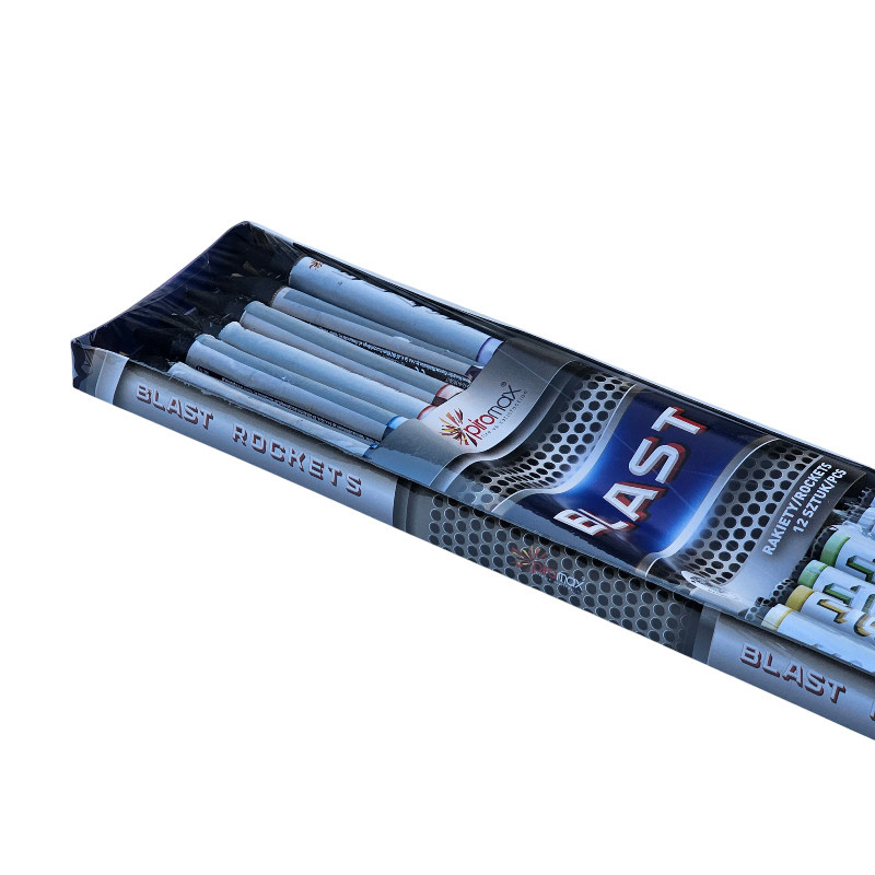 ZESTAW 12 RAKIET BLAST OD FIRMY PIROMAX. PO ODPALENIU CZEKAJĄ NAS EFEKTY: BIAŁE MIGOTANIE, ZIELONE MIGOTANIE, TRZESZCZENIE, CZERWONA GWIAZDA Z TRZESZCZENIEM, ZIELONA GWIAZDA Z TRZESZCZENIEM, KOLOROWE GWIAZDY.