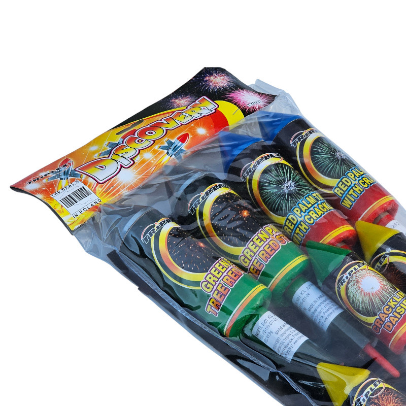 DISCOVERY TXR237 to zestaw 7 rakiet pirotechnicznych od renomowanej marki Triplex, które zapewnią efektowne dekoracje nieba podczas Twoich domowych uroczystości. Każda rakieta po wystrzeleniu tworzy pojedynczy, ale widowiskowy efekt świetlny, ozdabiając nocne niebo kolorowymi rozbłyskami.