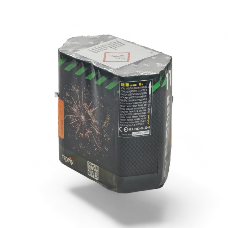 Bateria Exploder 11 to efektowny zestaw fajerwerków składający się z 13 strzałów o kalibrze 30 mm, który zapewni barwny pokaz podczas domowych uroczystości. Ten produkt marki Tropic oferuje około 30 sekund dynamicznego widowiska, gdzie każdy wystrzał tworzy na niebie kolorowe, trzeszczące stokrotki w trzech różnych barwach.