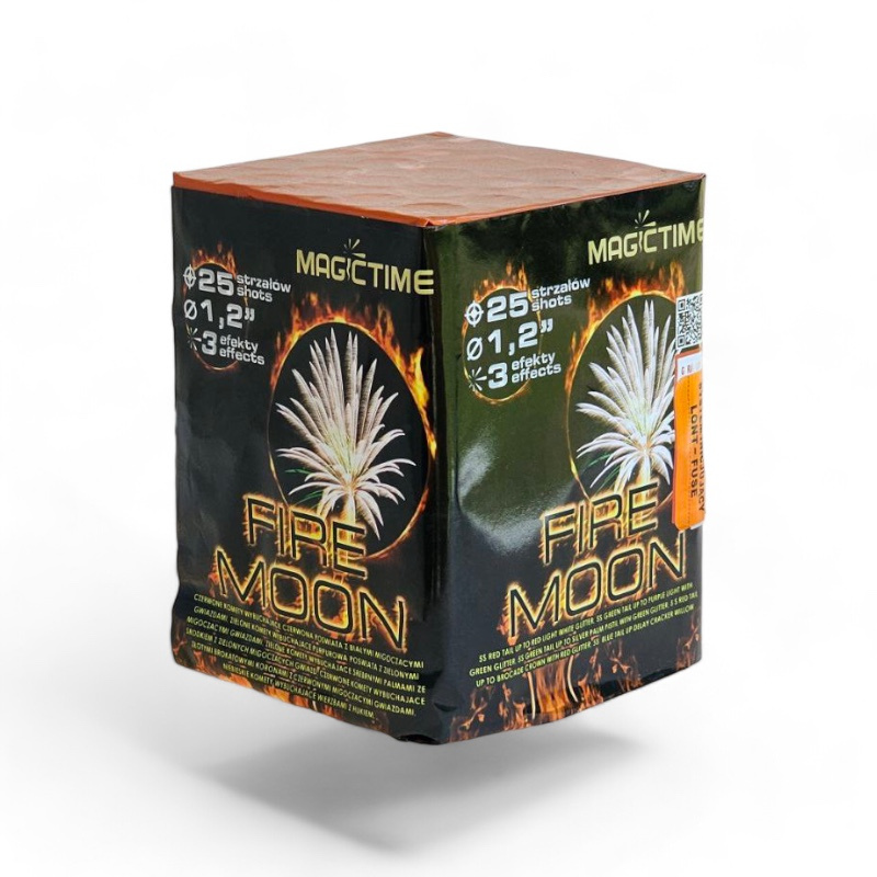 Wyrzutnia fajerwerków FIRE MOON to efektowny pokaz pirotechniczny od marki Kometa, który urozmaici każdą domową uroczystość. Ta 25-strzałowa bateria o kalibrze 30 mm oferuje różnorodne efekty świetlne, które będą ozdobą nieba przez około 30 sekund.