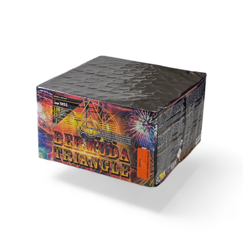 Przed uruchomieniem baterii TRÓJKĄT BERMUDZKI zapoznaj się dokładnie z instrukcją. Wybierz otwarty teren, z dala od budynków, drzew i innych przeszkód. Baterię ustaw na stabilnym, równym i niepalnym podłożu. Do odpalenia używaj wyłącznie długiej zapałki lub lontu, zachowując bezpieczną odległość. Po zakończeniu pokazu odczekaj minimum 15 minut przed zbliżeniem się do wyrzutni, aby upewnić się, że wszystkie ładunki zostały odpalone i urządzenie całkowicie wystygło.