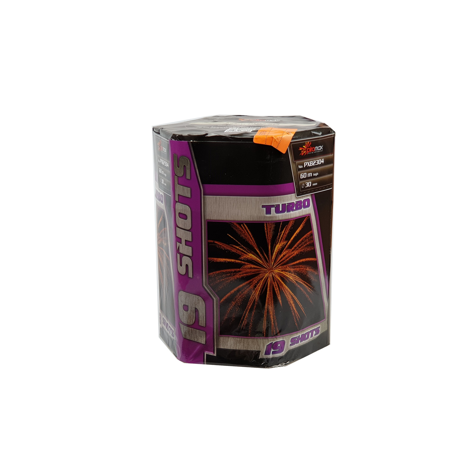 Wyrzutnia fajerwerków TURBO 19 strzałów 30MM to efektowny pokaz pirotechniczny marki Piromax, który zachwyci widzów pięknymi, niebieskimi efektami na nocnym niebie. Ten produkt klasy F3 oferuje spektakularne widowisko trwające około 30 sekund.