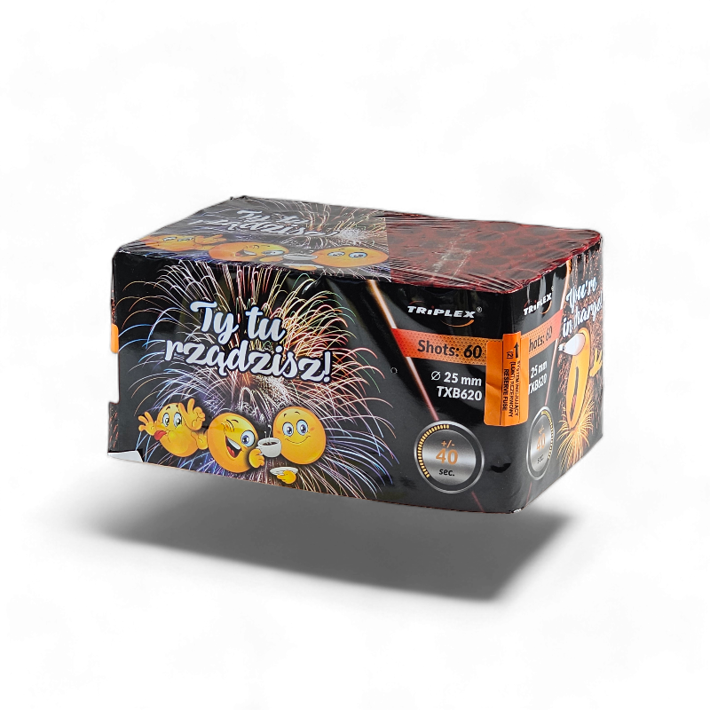 Wyrzutnia fajerwerków TY TU RZĄDZISZ to efektowny zestaw pirotechniczny marki Triplex, który zapewni atrakcyjne widowisko podczas domowych uroczystości. Ta bateria zawiera 60 strzałów o kalibrze 25mm, które przez około 20 sekund wypełnią nocne niebo kolorowymi efektami świetlnymi.