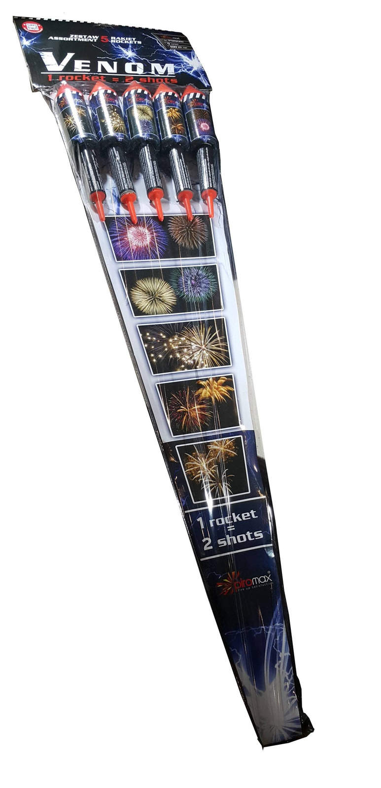 Spektakularny zestaw 5 rakiet VENOM marki Piromax to profesjonalny produkt pirotechniczny klasy F3, zapewniający niezapomniane wrażenia podczas pokazów fajerwerków.