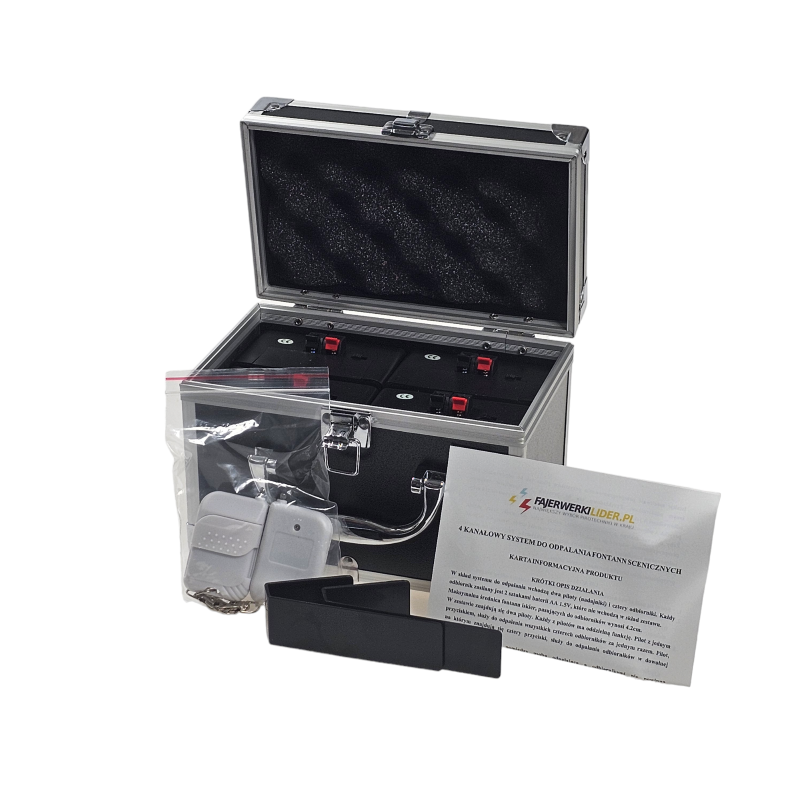 System do zdalnego odpalania.System zapakowany jest w elegancką i poręczną walizeczkę, w której znajdziesz cztery odbiorniki, dwa piloty oraz stelaże do odpalania kątowego.