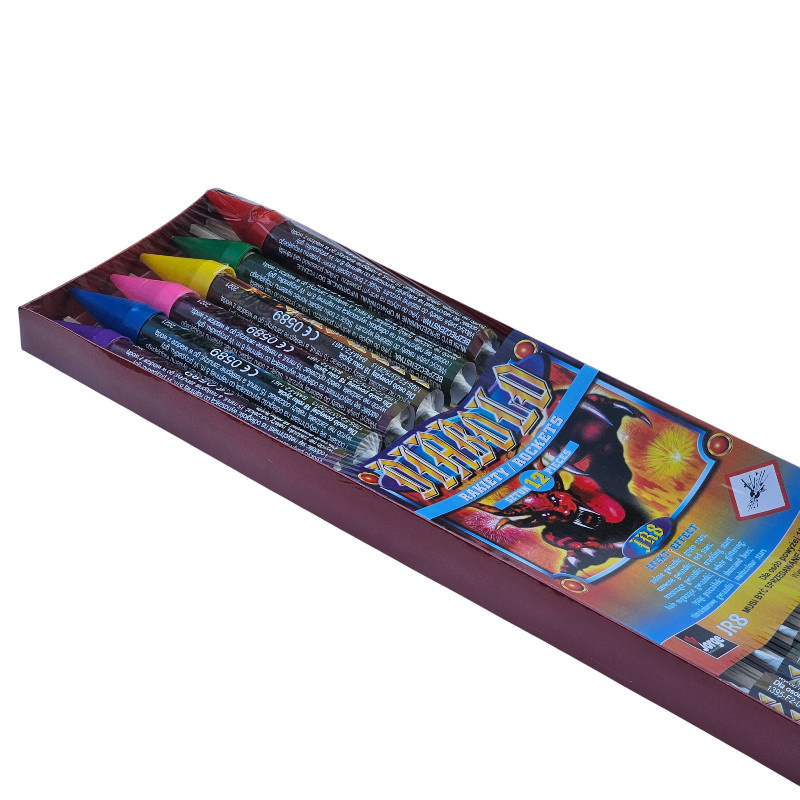 Zestaw 12 rakiet DIABLO od Jorge to doskonały wybór dla osób poszukujących atrakcyjnych efektów pirotechnicznych na domowe uroczystości. Dzięki różnorodnym efektom świetlnym w postaci kolorowych, trzaskających i migoczących gwiazdek, każdy pokaz stanie się niezapomnianym elementem Twojej imprezy. Produkt z certyfikacją F2 zapewnia bezpieczeństwo użytkowania przy zachowaniu podstawowych zasad ostrożności.