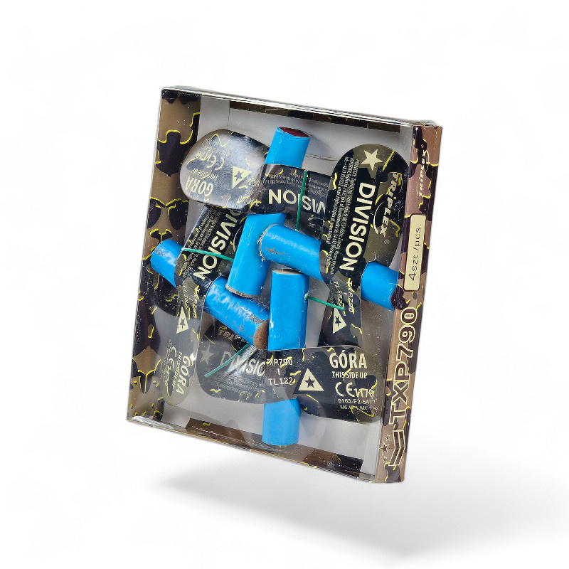 Division TXP790 to wyjątkowy pirobajer, idealny do stworzenia dynamicznego pokazu podczas letnich wieczorów czy kameralnych imprez. Każde z czterech śmigiełek oferuje fascynujący spektakl, łącząc efekt wznoszenia z hipnotyzującym ruchem wirowym i ognistym ogonem. To jak obserwowanie miniaturowych, wirujących ognistych komet na nocnym niebie! Kompaktowy zestaw czterech spinnerów pozwala na stworzenie krótkiego, ale intensywnego pokazu. Pamiętaj jednak, że choć efekt jest imponujący, produkt ten jest przeznaczony do osobistej rozrywki, nie na duże imprezy czy profesjonalne pokazy.