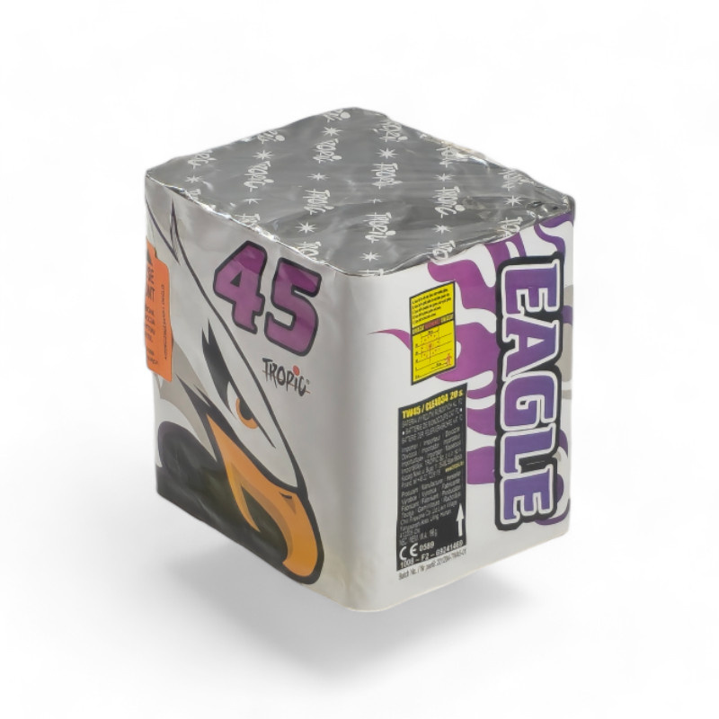 Wyrzutnia fajerwerków EAGLE45 to atrakcyjny pokaz pirotechniczny marki Tropic, oferujący 20 strzałów o kalibrze 25 mm. Ten efektowny zestaw zapewni przyjemne wrażenia wizualne dla Ciebie i Twoich gości przez około 30 sekund, wypełniając niebo kolorowymi efektami.