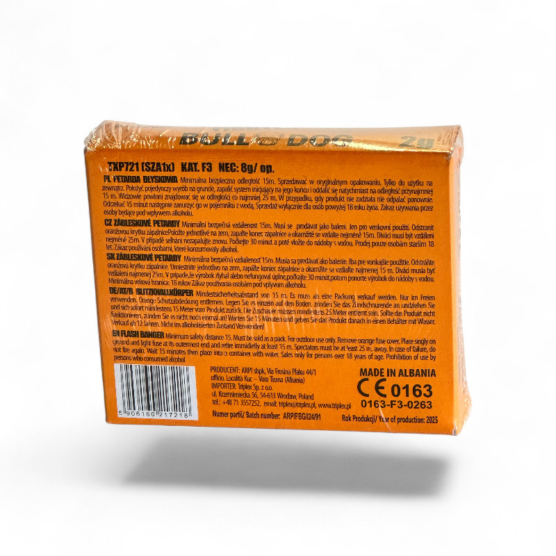 Aby bezpiecznie korzystać z petard Fighter Bulldog, należy używać ich wyłącznie na otwartej przestrzeni, z dala od budynków i łatwopalnych materiałów. Przed odpaleniem upewnij się, że w pobliżu nie ma ludzi ani zwierząt. Petardę należy umieścić na stabilnym podłożu, podpalić lont i natychmiast się oddalić na bezpieczną odległość. Pamiętaj, że produkt jest przeznaczony tylko dla osób pełnoletnich i nie wolno go używać pod wpływem alkoholu.