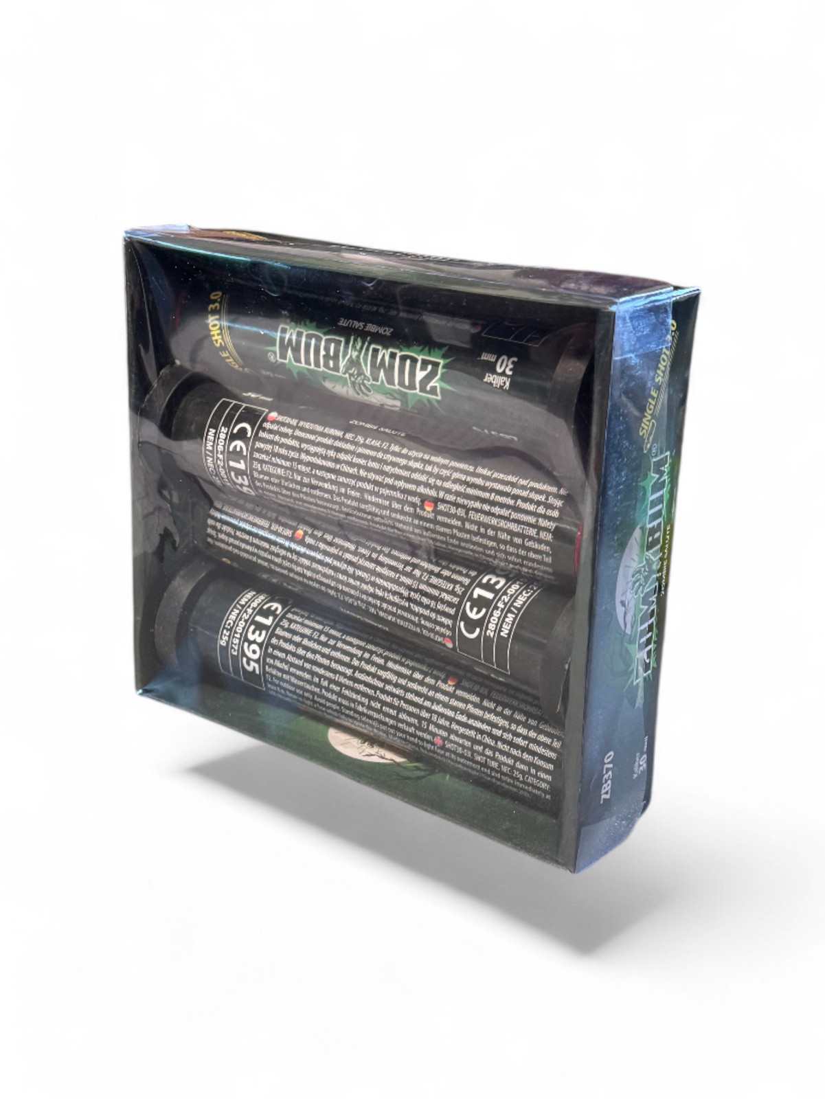 ZOM BUM SINGLE SHOT 3.0 to zestaw 4 pojedynczych strzałów (jednostrzałów) o kalibrze 30 mm, które zapewniają mocne i intensywne efekty dźwiękowe. Każdy jednostrzał marki Zom Bum wyróżnia się potężnym tytanowym wybuchem, który następuje po wystrzeleniu ładunku w powietrze.