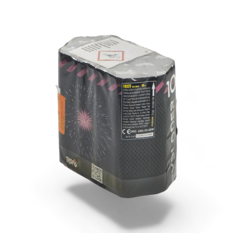 EXPLODER 10 to kompaktowa bateria fajerwerków od marki Tropic, oferująca 13 strzałów o kalibrze 30 mm, które rozświetlą niebo podczas Twojej sylwestrowej zabawy. Ten fajerwerk zapewnia widowiskowy pokaz kolorowych efektów, trwający około 30 sekund.
